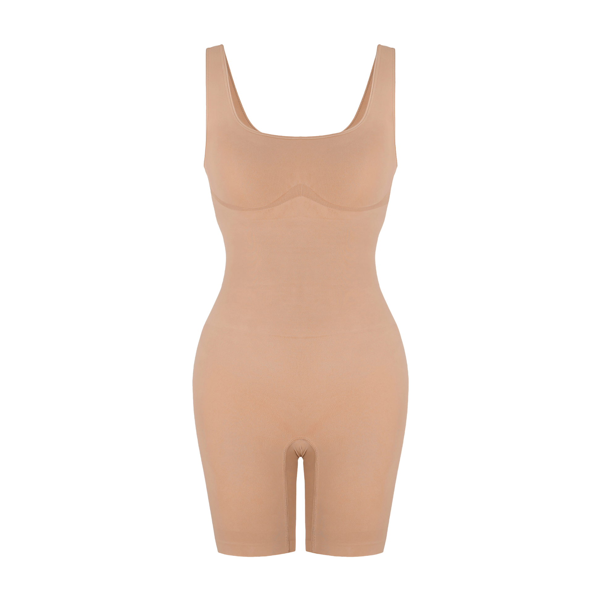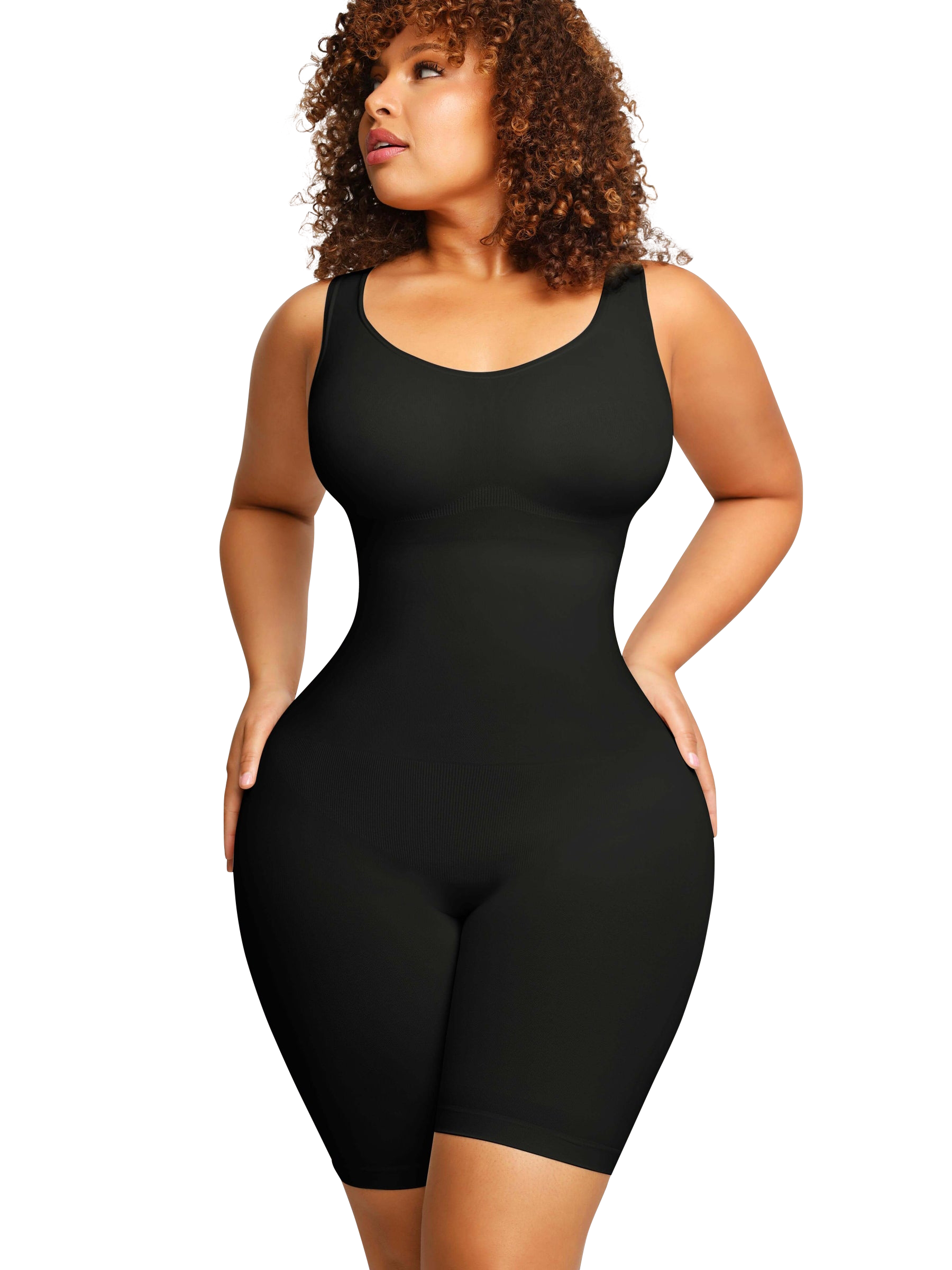 our "power" Eco-Comfort Seamless Mid Thigh Shapewear Bodysuit, crafted from eco-friendly materials for all-day comfort. Its recycled, breathable fabric ensures a cozy fit, ideal for daily wear with any ensemble, whether it's paired with an opened loose fitted button down or worn solo.